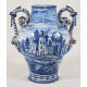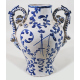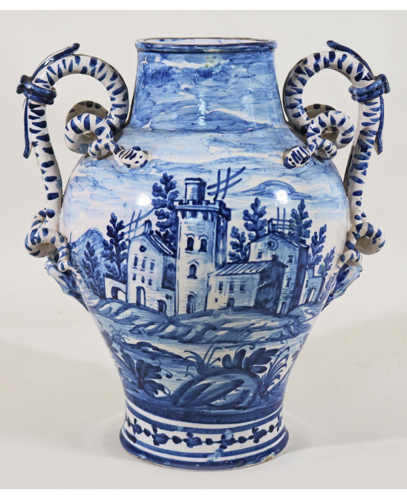 Vaso in maiolica a fondo bianco dipinta in blu con caseggiati ed alberi. Anse a serpente con attacco a mascherone. Sul retro, lanterna coronata in riserve vegetali. Savona, fine sec. XVIII. Alt. cm40
