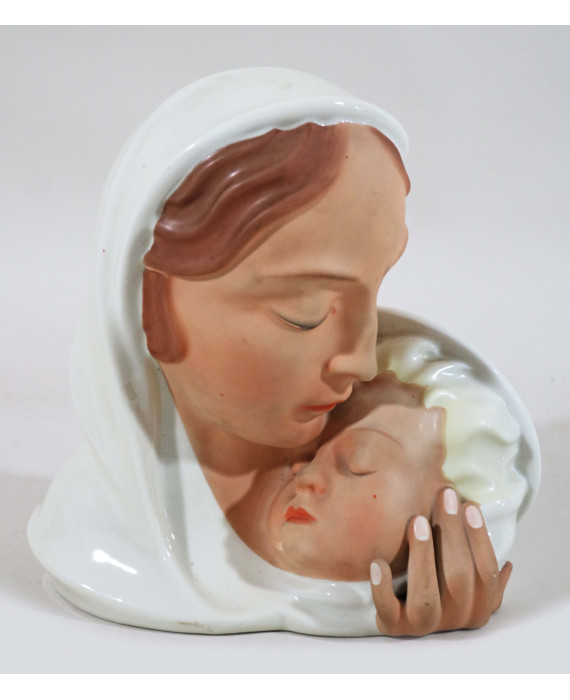 Gruppo in porcellana dipinta raffigurante Madonna con Bambino, marcata sul fondo Pirken Hammer. Alt. cm25