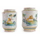 Lotto di due albarelli similari in maiolica a fondo bianco dipinta in verde e giallo con caseggiati, viandante e pavone con farfalla. Liguria, sec. XVIII. Alt. cm24/25 (scheggiature)