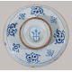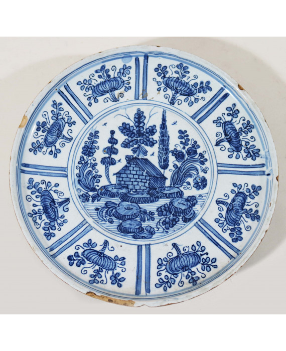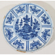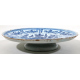 Alzatina in maiolica dipinta con decoro monocromo turchino calligrafico con vasi fioriti e caseggiato. Savona, sec. XVI. Diam. cm22 (scheggiature)