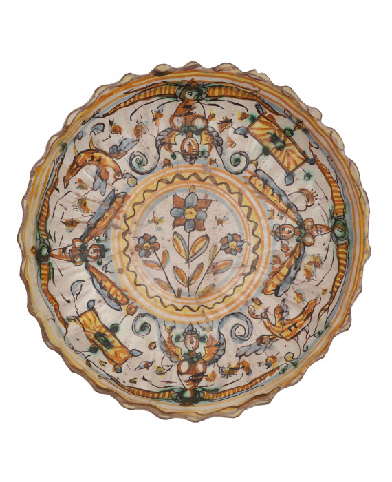 Alzatina in maiolica con tesa dipinta a grottesche e centrale con fiori. Urbania, sec. XVII. Diam. cm22
