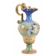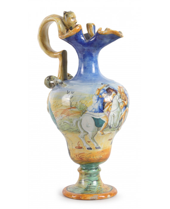 Versatoio in maiolica dipinta con scena di battaglia, ansa zoomorfa con attacco a mascherone, base circolare. Urbino, sec. XIX. Alt. cm32 (abrasioni)