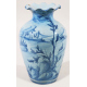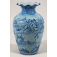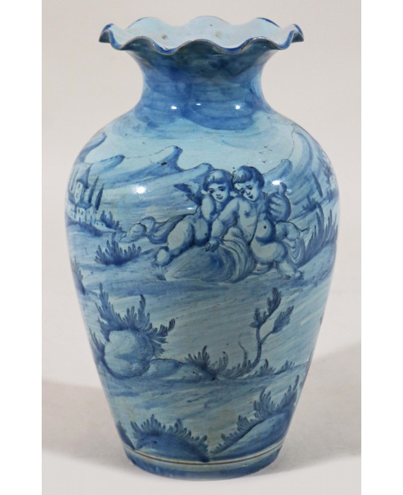 Vaso in maiolica a fondo azzurro dipinto in blu con paesaggio e putti alati con spighe. Savona, fine sec. XIX. Alt. cm29 (scheggiatura)