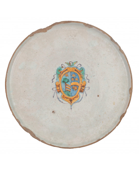 Alzata in maiolica a fondo bianco dipinta con stemma araldico centrale. Faenza, sec. XVII. Diam. cm25 (mancanze al bordo)