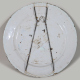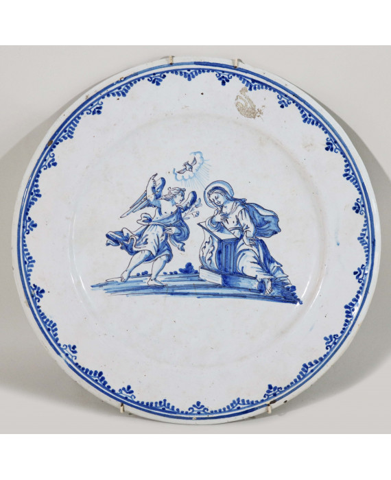 Piatto in maiolica a fondo bianco dipinta in blu con Annunciazione. Sul fondo lettere A M O graffite. Liguria, fine sec. XVIII. Diam. cm34 (lievi scheggiature)