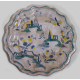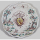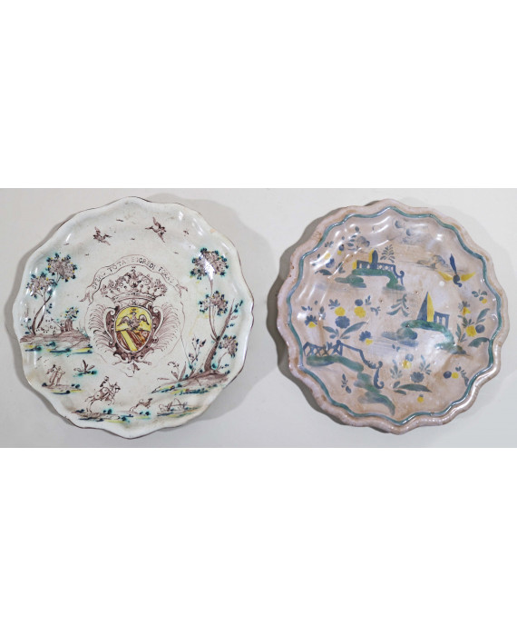 Lotto di due piatti in maiolica: uno dipinto con caseggiati, personaggi e stemma araldico centrale con motto ed uno dipinto con elementi architettonici e motivi floreali. Savona, sec. XVIII. diam. cm23/22 ( restauri al piatto stemmato)