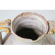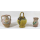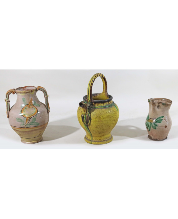 Lotto di un catino in terracotta a fondo giallo con beccuccio a testa zoomorfa, centro Italia sec XIX, un boccale ed un vaso biansato in maiolica dipinta con frutta e racemi vegetali, manifattura del sud italia del sec. XIX. Alt. cm34/20/28 (piccoli restauri e scheggiature)