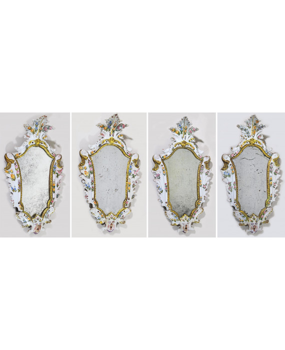 Serie di quattro specchierine in maiolica dorata e dipinta con serti floreali e mascherone. Manifattura di Bassano, fine sec. XIX. cm63x33