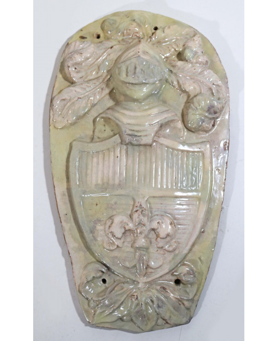 Stemma araldico in terracotta smaltata con giglio e cimiero piumato. Italia centrale sec. XVIII. cm42x23