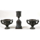 Lotto di tre fusioni in bronzo brunito: una coppa sbalzata putti musici e figure mitologiche ed una coppia di vasi biansati riproduzioni del celebre vaso Warwick. Alt. cm28/14(2)