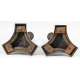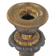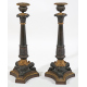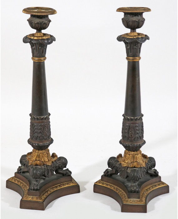 Coppia di candelieri in bronzo brunito e dorato con fusto a cilindro e base a tripode con peducci a zampa. Francia, sec. XIX. Alt. cm35