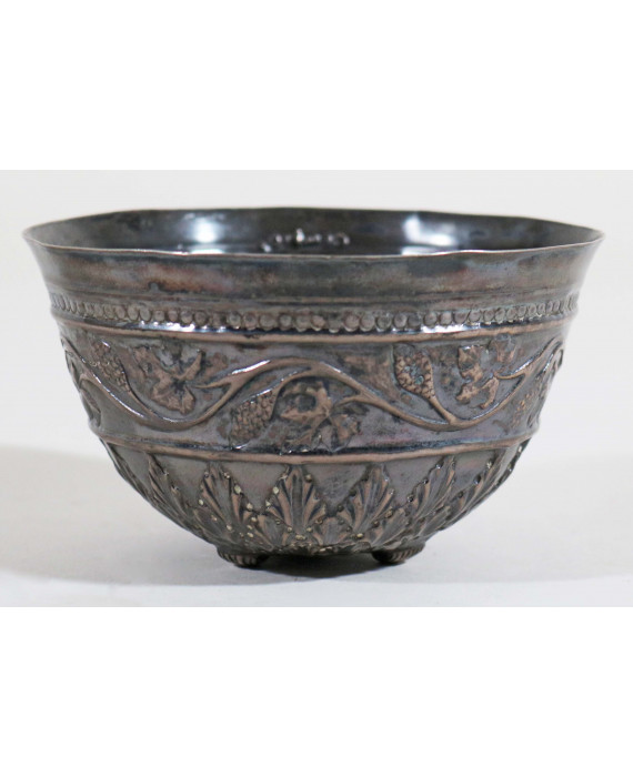 Vincenzo Gemito (1852-1929). Coppetta ornamentale in argento sbalzato con tralci di vite e foglie d'acanto, con tre peducci a conchiglia, firmato sul bordo. Alt. cm6,5; diam. cm11,5. Peso gr. 100