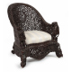 Particolare poltrona in legno interamente intagliato e traforato con serti vegetali e animali, braccioli terminanti a testa di drago, sostegni con peduccio a ricciolo, seduta rivestita in stoffa. Manifattura anglo-indiana, sec. XIX (piccole mancanze)