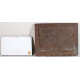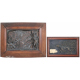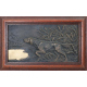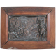 Lotto di due bassorilievi in bronzo patinato: uno raffigurante scena d'interno con musicanti ed uno raffigurante cane da caccia, con cornici. cm24x37/18x32