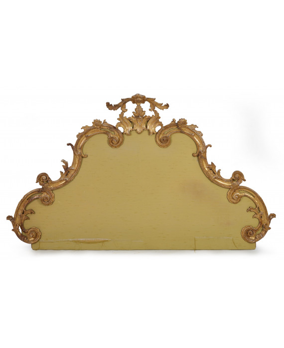 Testata di letto matrimoniale realizzata con fregi del sec. XVIII in legno dorato ed intagliato a volute e fiori. cm120x203 (restauri e mancanze alla doratura)