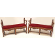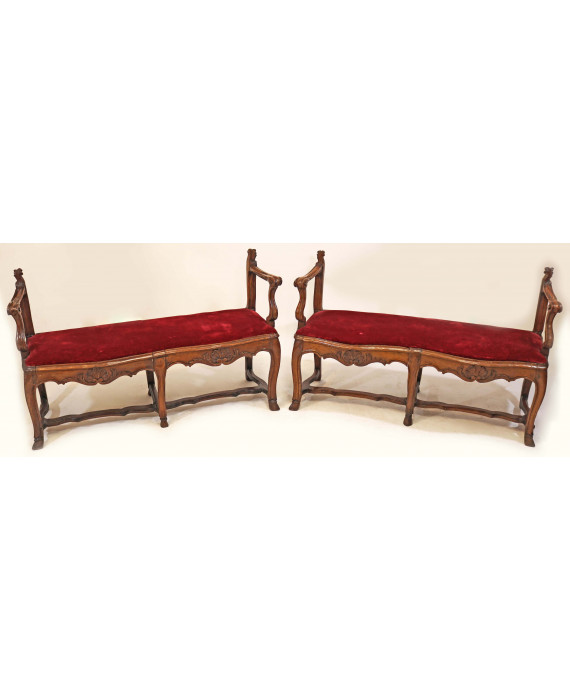 Coppia di panchette a due posti in legno di noce, sei sostegni a voluta raccordati da traverse, braccioli mossi, seduta rivestita in velluto. Italia, periodo del Direttorio, fine sec. XVIII.