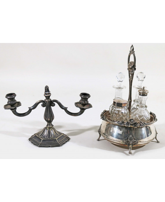 Lotto di un'oliera in argento con bolli non identificati, con quattro ampolle in vetro ed un candelabro a due fiamme in argento 800. Peso dell'oliera gr.440