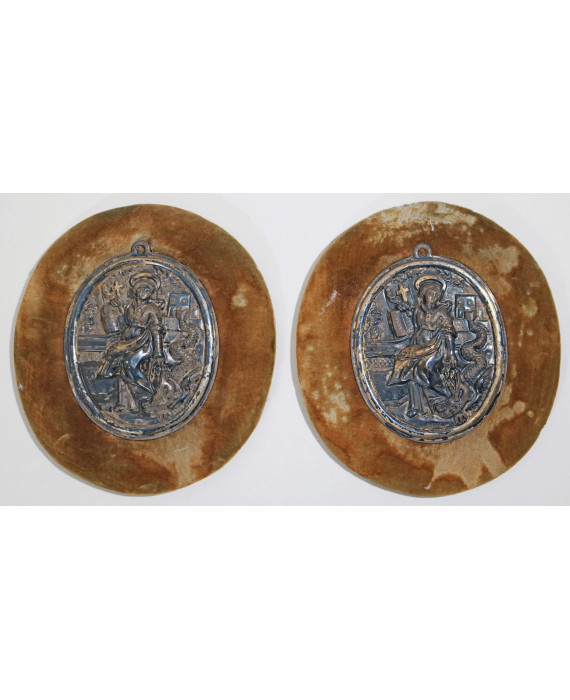 Coppia di placche ovali in argento sbalzato raffiguranti Sant'Agata, montate su supporto in velluto. Bolli Napoli per gli oggetti sacri, sec. XIX, argentiere De Michele Luigi (attivo nella metà del sec. XIX). cm11x9