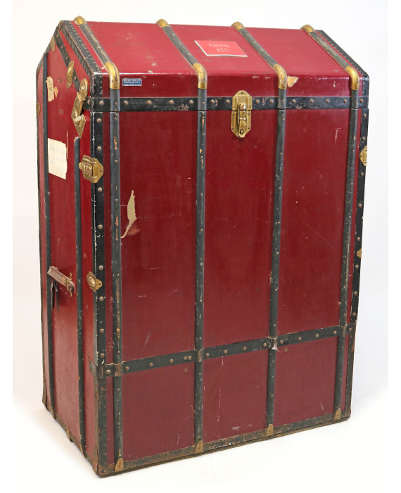 Grande baule da viaggio a fondo bordeaux, con all'interno appendiabiti e cassetti, appartenuto all'attrice Adriana Asti. cm147x100x60 (difetti)