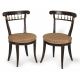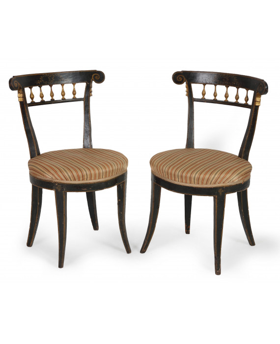 Coppia di sedie in legno ebanizzato con decori in oro, gambe mosse, schienale a giorno e seduta rivestita in stoffa. Italia, sec. XVIII. (segni del tempo)