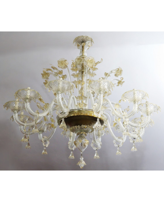 Grande lampadario a 12 luci in vetro trasparente di Murano con inclusioni dorate. Alt. cm130 ; diam. cm140