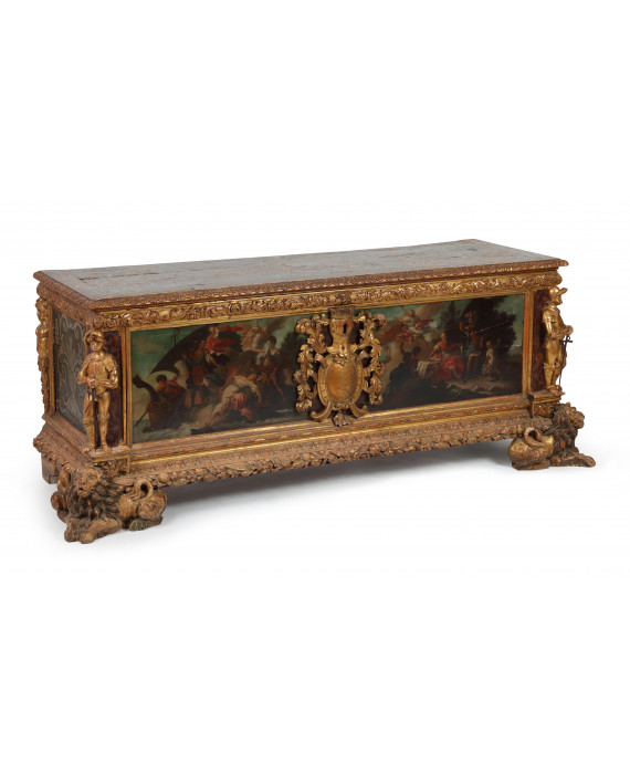 Importante e rara cassapanca eclettica con piano e laterali dipinti nei toni del verde con serti vegetali e profilo classico centrale, fronte finemente dipinto con scene tratte dalla vita di Enea, intervallate da stemma araldico centrale con cimiero in legno dorato ed intagliato, paraste laterali con soldati in armatura con spade in ferro, poggianti su leoni sdraiati, fascia inferiore riccamente intagliata con serti di frutta. Firenze, sec. XIX. cm67x176x64 (piccola mancanza, cadute di colore, difetti al piano e usure del tempo)