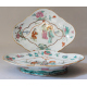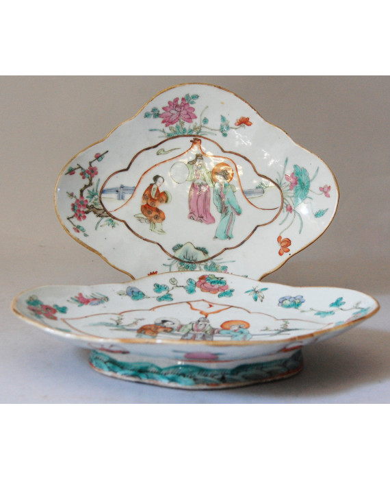 Lotto di due alzatine in porcellana dipinta con serti floreali e riquadri con personaggi. Cina, famiglia rosa, sec. XIX. cm6x27x22