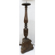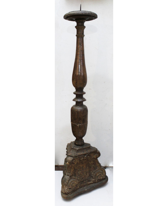 Coppia di torcieri in legno tinto a noce, fusto tornito, poggiante su base a tripode intagliata con girali floreali e volute. Italia, sec. XVI. Alt. cm150 (difetti e mancanze)