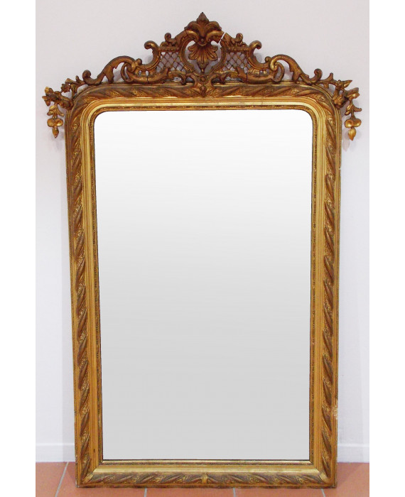 Specchiera in legno e stucco dorato con cimasa lavorata a volute e fiori. Italia, sec. XIX. cm163x104 (difetti)
