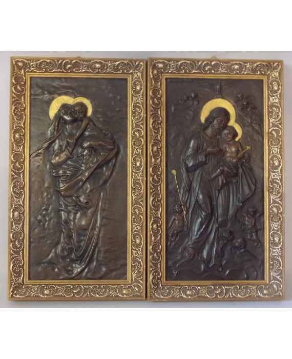 Coppia di placche in bronzo brunito raffiguranti San Giuseppe con Bambino ed amorini e Madonna con Bambino, con cornici. cm41x20