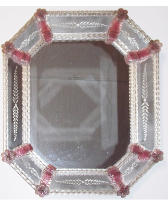Specchiera in vetro trasparente e rosa di Murano, decorata con fiori. cm65x56