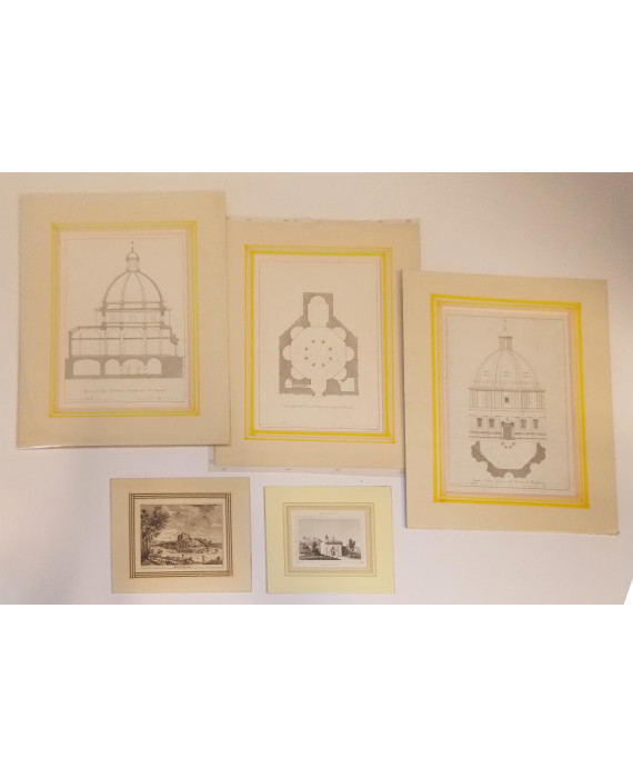 Lotto di cinque incisioni del sec. XVIII e XIX: Veduta di Montefiascone (De Roggisant. Les delices de l’Italie. Parigi, 1707); Veduta della chiesa di San Flaviano a Montefiascone (Italie pictoresque. Parigi, 1836); Pianta inferiore del Duomo di Montefiascone (Ronzani, sec. XIX); Spaccato per lungo del Duomo di Montefiascone (Ronzani, sec. XIX); Prospetto e Pianta Superiore del Duomo di Montefiascone (Ronzani, sec. XIX). cm12x15/11x14/34x23(3)