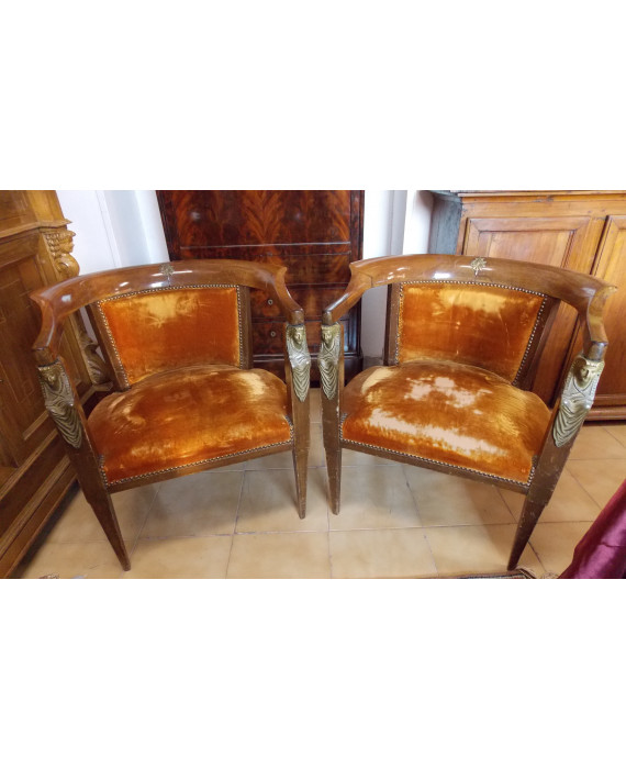 Coppia di poltrone a pozzetto in legno di mogano, sfingi laterali in bronzo dorato, seduta e spalliera rivestite in velluto (difetti)