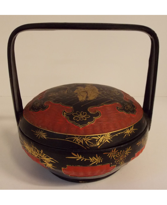 Cestino in rattan laccato a fondo nero e rosso e dipinto oro con personaggi e fiori. Cina, sec. XX. Alt. cm33