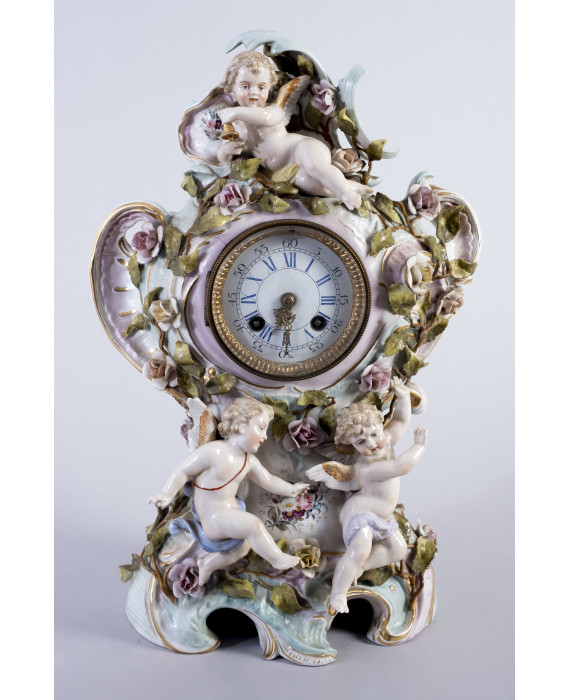 Orologio da tavolo in porcellana dipinta ed interamente lavorato con rami fioriti, volute e putti alati, quadrante in smalto. manifattura Shierholz, Germania, fine sec. XIX. Alt. cm40 (lievi difetti e scheggiature)