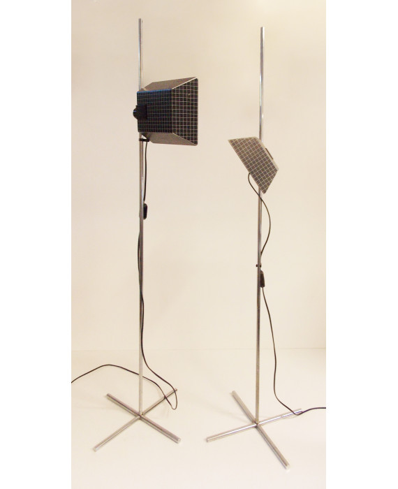 Coppia di lampade da terra con fusto in metallo cromato e paralumi in alluminio verniciato. Manifattura Targetti, modello Study, anni ’70. Alt. cm136