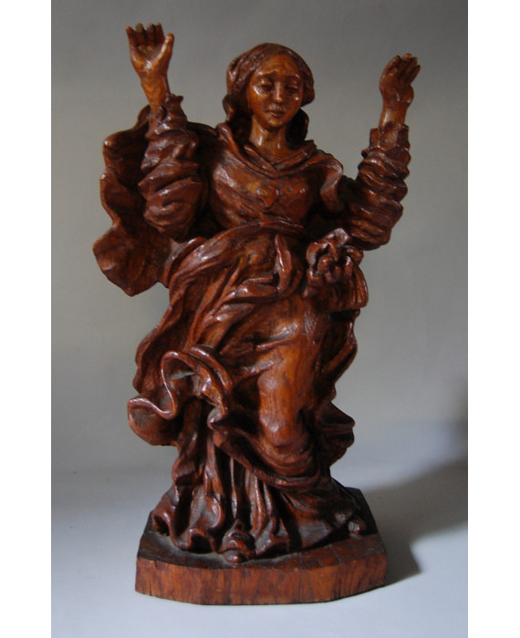 Statua in legno di rovere del sec. XIX raffigurante Madonna orante. Alt. cm61 (alcune mancanze)