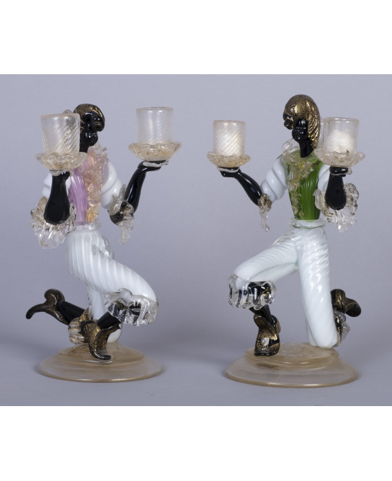 Coppia di candelabri a due fiamme in vetro di Murano policromo raffiguranti mori inginocchiati. Alt. cm24 (lievi scheggiature)