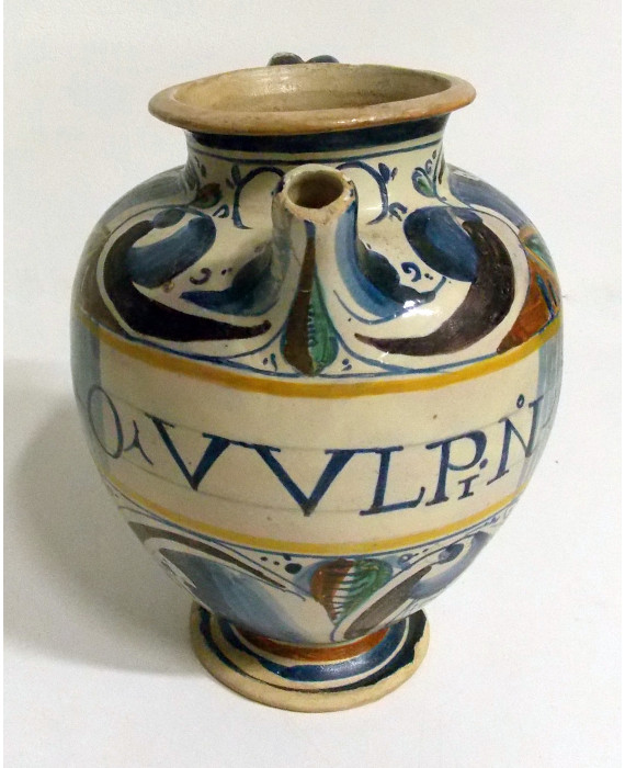 Orciolo in maiolica dipinta a motivi vegetali, iscrizione OVVLPiN centrale, data 1560 sul retro, manico a voluta con attacco a riccioli. Roma, metà del sec. XVI. Alt. cm21 (scheggiture e restauri)