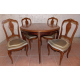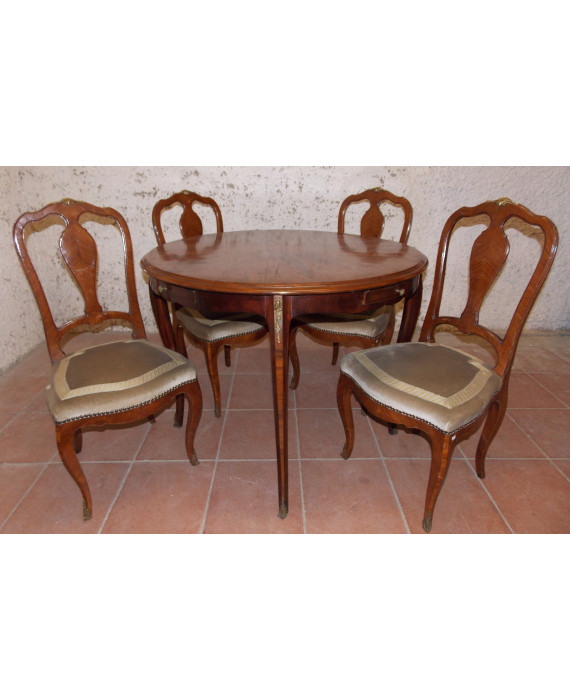 Set composto da un tavolo tondo a quattro cassetti impiallacciato in bois de violette, quattro gambe mosse ed applicazioni in bronzo, con quattro sedie di accompagno con sedute rivestite in stoffa. Alt. cm75; diam. cm95 (lievi difetti)
