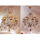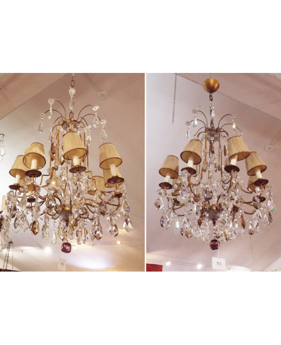 Coppia di lampadari otto a luci con struttura in metallo dorato e pendenti in vetro (difetti)