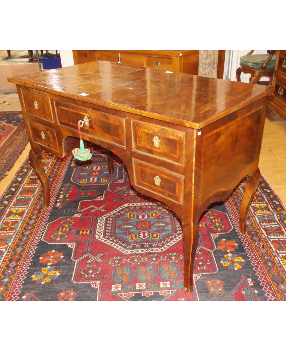 Scrivania lastronata in legno di noce e filettata in bois de rose, cinque cassetti, quattro gambe mosse. Italia, sec. XVIII. cm77x111x60 (lievi mancanze e restauri)