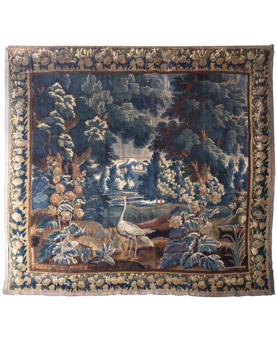 Raro arazzo fiammingo raffigurante paesaggio fluviale, cicogna ed alberi. Europa del nord, sec. XVIII. cm300x295 (strappi e fori)