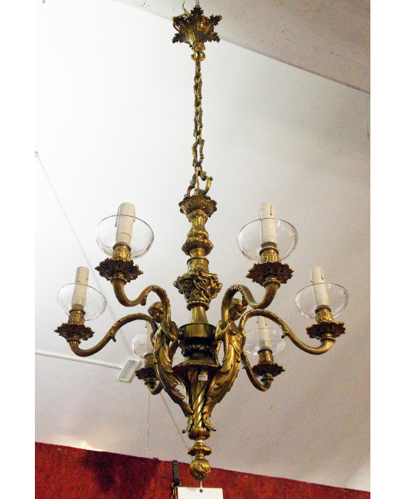 Lampadario a sei luci in bronzo dorato lavorato con figure femminili, volute vegetali e fiori.