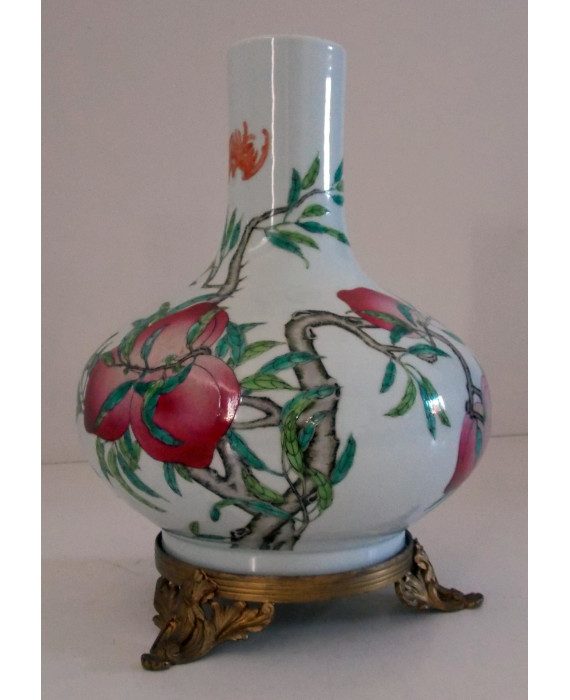 Vaso in porcellana dipinta con rami di pesche, con base in bronzo dorato. Cina, sec. XX. Alt. cm36