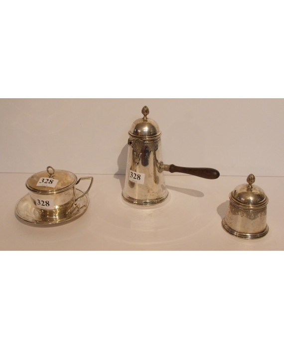 Lotto di tre oggetti in argento: un set di una cioccolatiera ed una zuccheriera, con bolli 800 ed una tazza da consommè con piattino, con bolli Austria-Ungheria del sec. XIX. Peso tot. gr. 900
