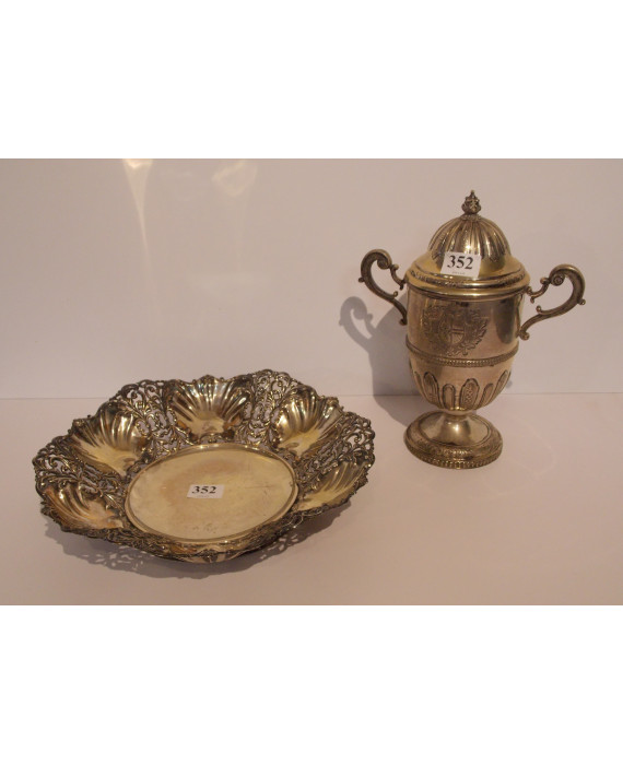 Lotto di due oggetti in argento 800: un centrotavola lavorato e traforato a conchiglie e volute vegetali ed una coppa biansata con coperchio e stemma araldico inciso. Diam. cm34; alt. cm30. Peso tot. gr. 1520