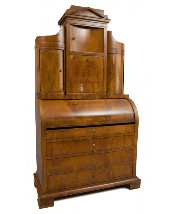Mobile a tre corpi impiallacciato in legno di mogano, tre sportelli superiori ed uno centrale a calatoia con all'interno sei cassettini, uno sportello ed un vano a giorno, scrittoio a rullo apribile con all'interno nove cassetti ed uno sportello centrale, due vani a scomparsa laterale e piano in pelle, tre cassetti inferiori. Austria, sec. XIX. cm224x132x62 (lievi difetti)