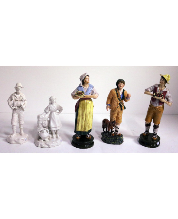 Lotto di cinque statuine in ceramica: una serie di tre dipinte raffiguranti contadino, pastore e popolana, marcate sul fondo Fratelli Mastroianni - Arpino; una coppia a fondo bianco raffigurante pastorello e acquaiola, firmate E. Mastroianni - Arpino. Alt. cm33/30/32/28/22 (scheggiature, mancanze e restauri)