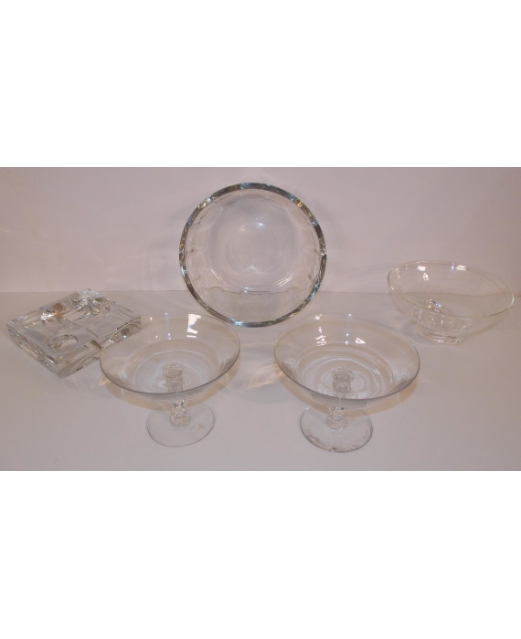 Lotto di cinque oggetti in cristallo trasparente: un centrotavola firmato Van St Lambert, un posacenere marcato Baccarat, una coppia di alzate ed un centrotavola con firme illeggibili (scheggiature al posacenere)